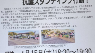 4・15緊急抗議スタンディング 星田駅前で 米国とイスラエルは2月28日にイランに対して先制攻撃を行ない、1ヶ月が経過しました。どんな理由であれ、主権国家に対して軍事攻撃は許されません。巻き添えで、多くのイラン国民が亡くなっています。...