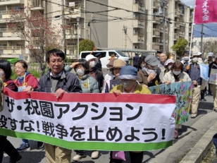 「祝園にミサイル弾薬庫はいらない」集会(梅が枝公園)~交野市駅までパレードをしました。4月ガザ・祝園写真パネル展を開催。ガザ・祝園の写真を105枚貼出しました。ガザ・パレスチナや祝園の写真を多くの方が熱心に見ていました。