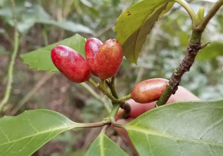秋になると雌株に楕円形の小指大ほどの果実が赤く熟し、十二月から五月ごろまでついています。熟し実に主にヒヨドリに食べられるようです。冬季に、真つ赤に熟した実をつけ、つやのある葉の間から見え隠れする様に風情あると、冬枯れの庭木彩りとして、また坪庭などにも取り入られています。庭木としての歴史も長いことから、斑入り葉の種類も多く、木の高さの高低など数多くの園芸品も存在します。 民間薬として、この葉を火にあぶって、ペースト状にしたものを火傷、腫物、創傷に効くと塗られた経験をお持ちの方もあるかと思います。