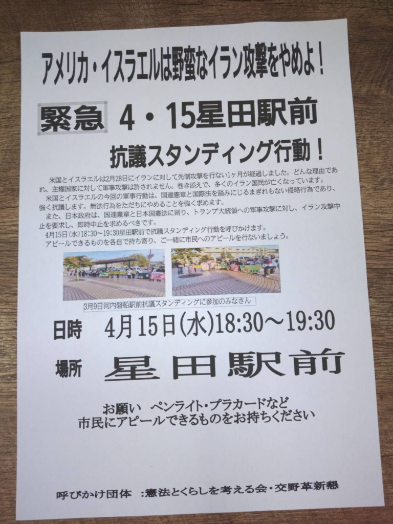 また、日本政府は、国連憲章と日本国憲法にのっとり、トランプ大統領への軍事攻撃に対し、イラン攻撃中止を要求し、即時中止を求めるべきです。4月15日(水)18:30~19:30星田駅前で、抗議スタンディング行動を呼びかけます。アピールできるものを各自で持ちより、ごいっしょに市民へのアピールを行ないましょう。