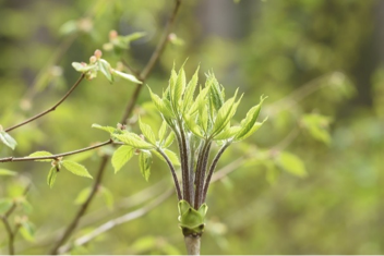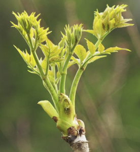 タラの芽は山菜の王様、コシアブラは女王といわれています。桜の開花とともに新芽の採取適期を迎えます。どちらもウゴギ科の木ですが、タラの芽の方はマスコミにも紹介されてもてはやされ有名になりすぎて、一般にもよく知られています。また、茎一面にトゲがあって見分けやすいことから山道脇に生えているものは、ほとんど新芽が折り取られている状態です。