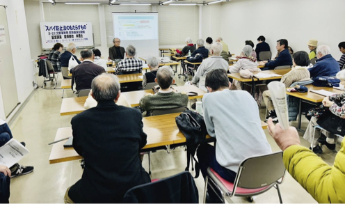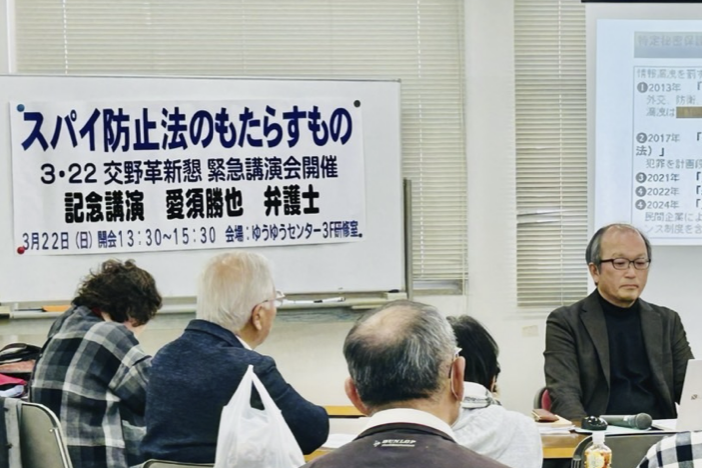 3月22日、交野ゆうゆうセンターにおいて、「スパイ防止法のもたらすもの」のテーマで緊急講演会を開催、講師の愛須勝也弁護士が詳しく分りやすく話をされました。